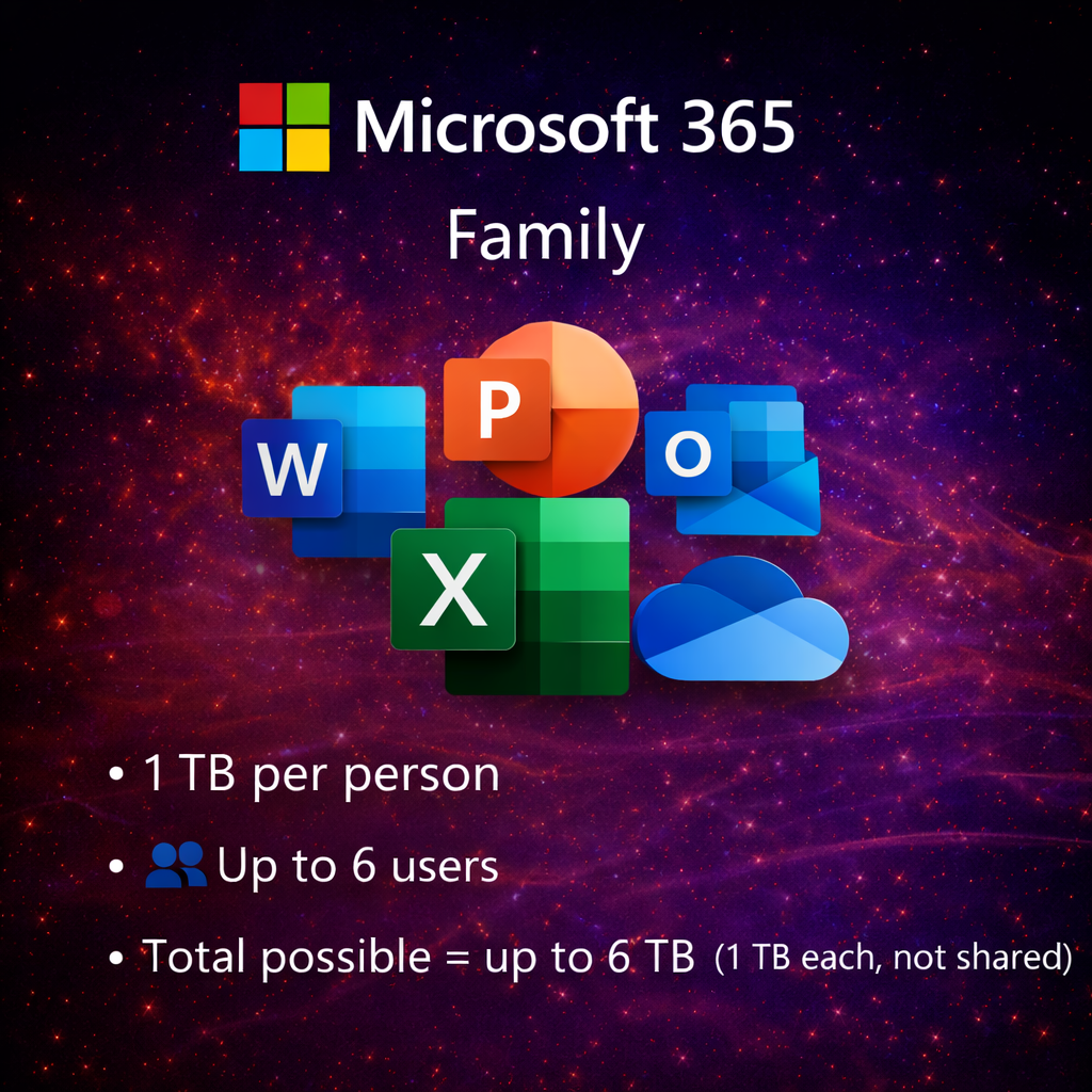 Microsoft 365 Family provides premium Office apps, cloud storage, and security features for up to 6 users, all in one convenient subscription.